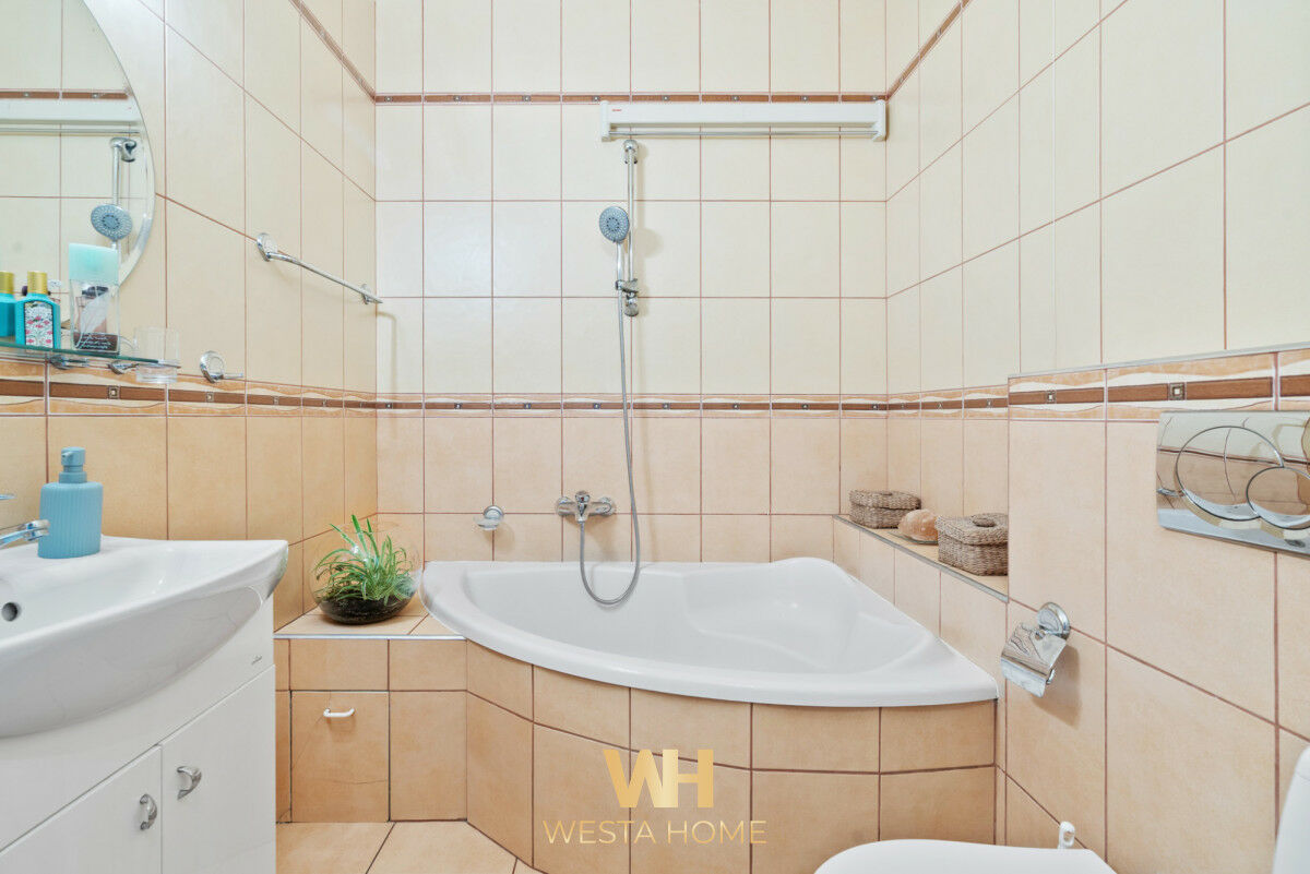 ✔ - łazienka z wanną i z WC o powierzchni 5 m2, zaprojektowana z dbałością o detale, gdzie możesz się zrelaksować podczas długich kąpieli.