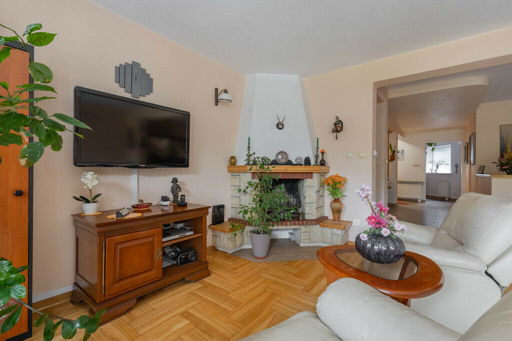 przestronny salon z kominkiem stanowią serce domu – to tu toczy